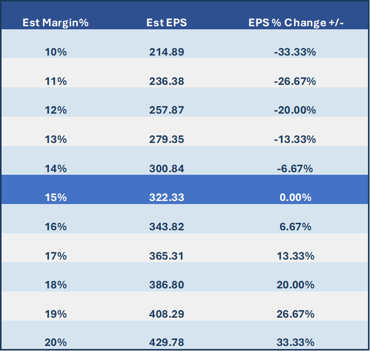 A 1% +/- change in margins results in EPS moving ~ 7% up or down.