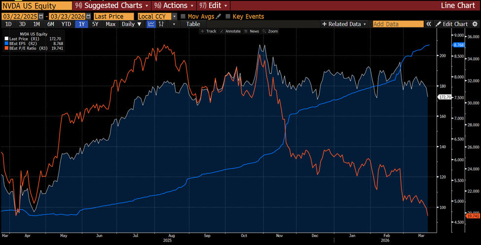 In theory, Nvidia is cheaper than Exxon which is interesting if nothing else considering their respective businesses. Nvidia’s EPS estimates have never been higher, but their multiple has dropped from over 34 to its current level. Nvidia has been flattish since November.