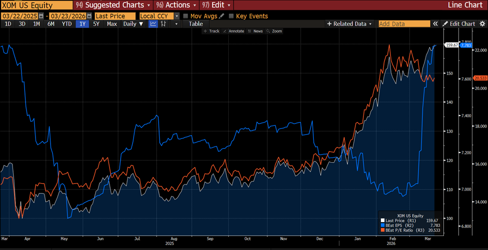 Rather than anointing ourselves Nostradamus, it was simply the fact that it was out of favor. In Exxon’s case, the market multiple expanded ahead of analysts revising earnings upward.