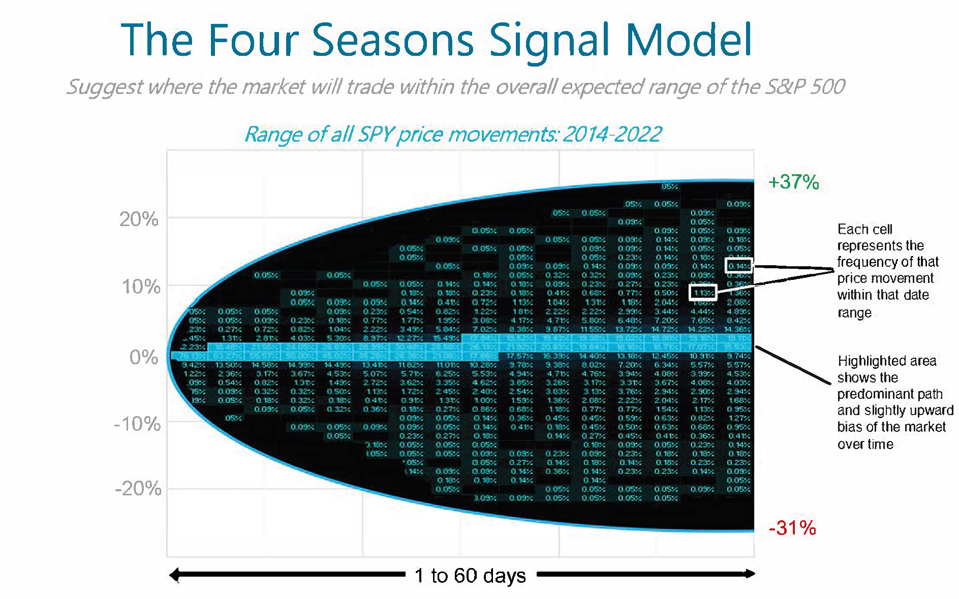 The Four Seasons strategy is a quantitative dynamic model that looks to identify both the direction of the broad market and the potential range of price movements. ZEGA uses 19 different volatility-based triggers that provide signals to indicate one of 4 seasons: