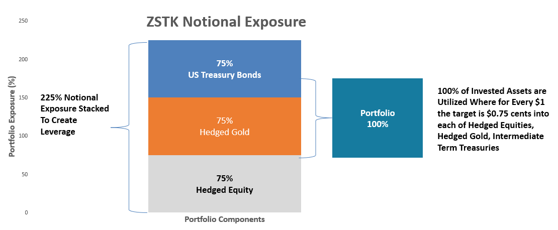 Using a stacked (portable alpha) approach, ZEGA employs synthetic options positions to replicate long ownership of multiple asset classes while preserving capital efficiency. This structure allows each invested dollar to target exposure across several return drivers without requiring the sale of one asset to fund another.